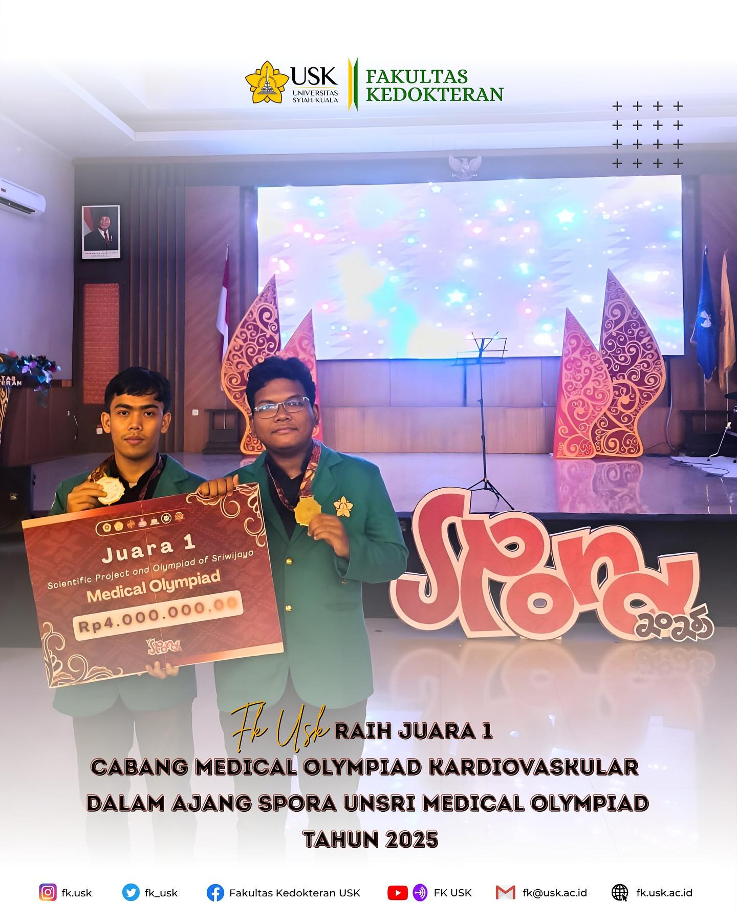 Alhamdulillah, kembali mendapatkan kabar bahagia, mahasiswa FK USK, Luthfi Hamda dan M. Farras Munawwar meraih Juara 1 Cabang Medical Olympiad Kardiovaskular dalam ajang SPORA UNSRI Medical Olympiad Tahun 2025...