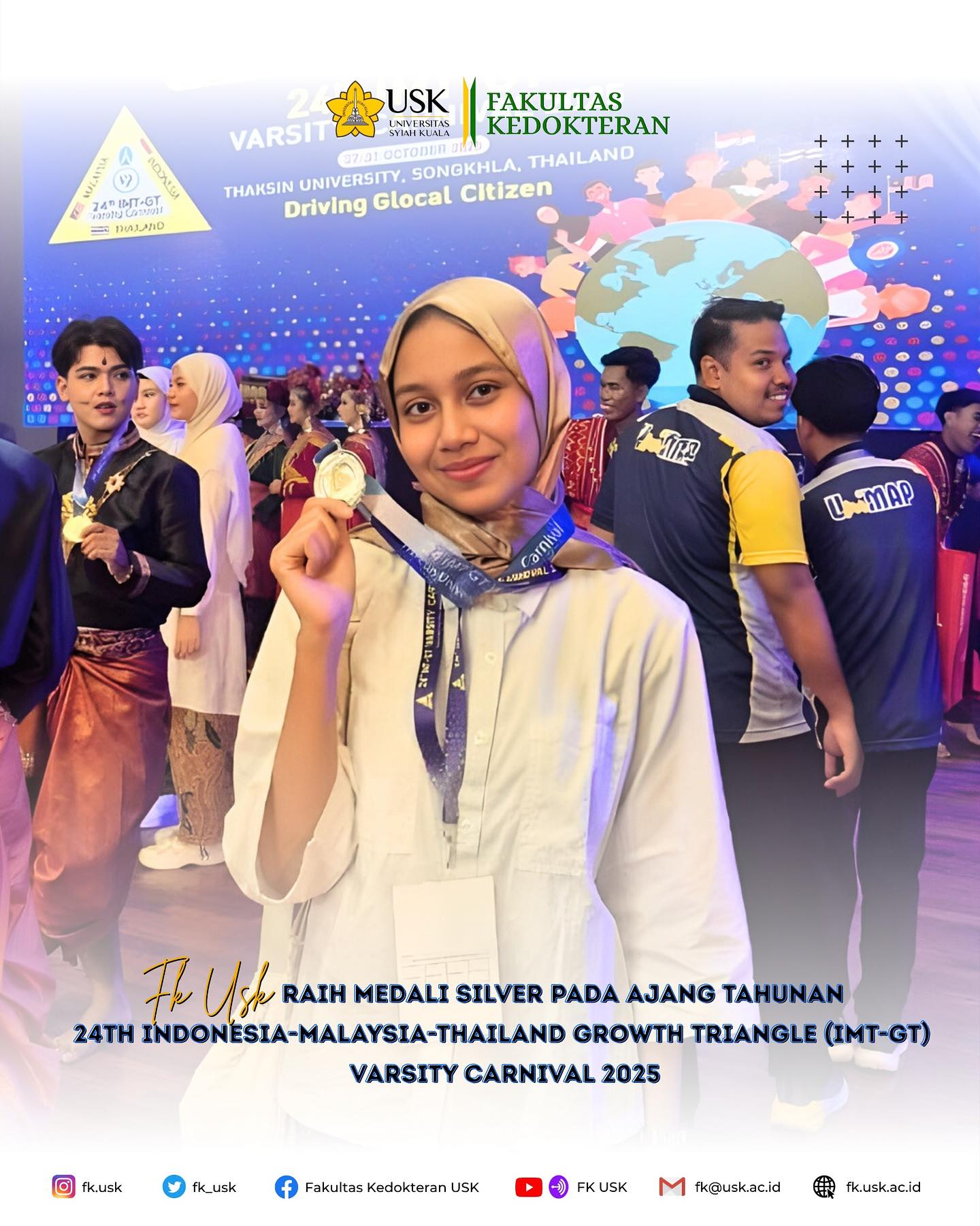 Alhamdulillah mahasiswa FK USK, Ghaisa Hayya Alhaura Muchsin kembali meraih prestasi dengan membawa pulang Medali Silver pada ajang tahunan 24th Indonesia-Malaysia-Thailand Growth Triangle (IMT-GT) Varsity Carnival 2025 yang diselenggarakan...