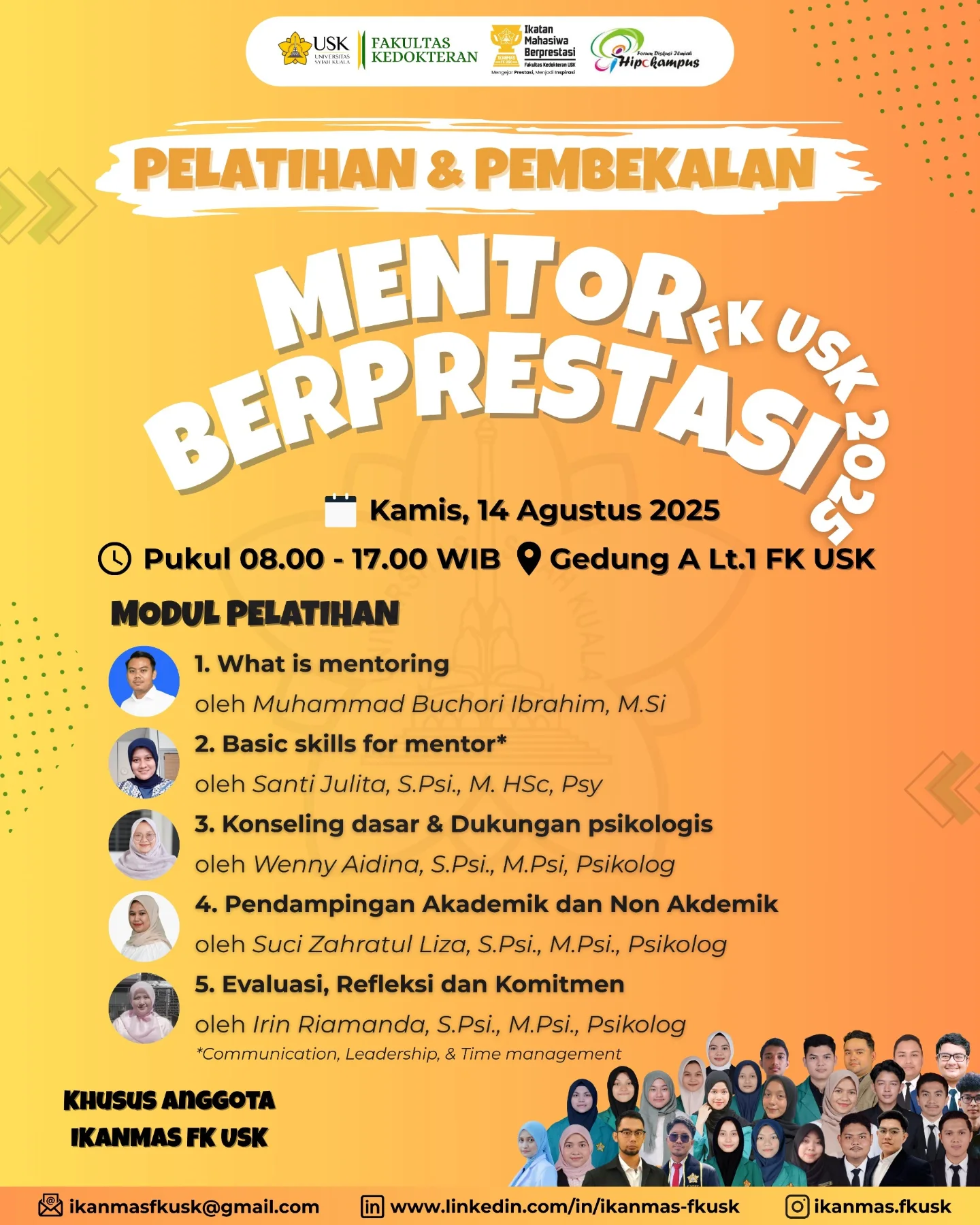 📅 Kamis, 14 Agustus 2025🕗 08.00 – 17.00 WIB📍 Gedung A Lt.1 FK USK 🔹 Khusus Anggota IKANMAS FK USKPelatihan ini dirancang untuk membekali para mentor dengan keterampilan komunikasi,...