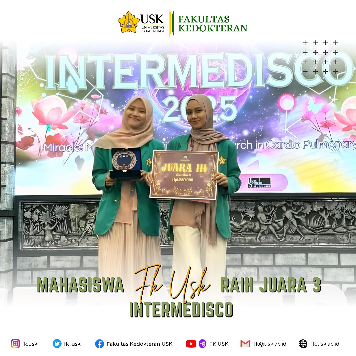 Mahasiswa FK USK Raih Juara 3 INTERMEDISCO Selamat kepada Ghaisya Al Haura Hayya Muhsin dan Khairasayyidah (PD’22) yang berhasil meraih Juara 3 lomba esai di INTERMEDISCO (Interfaculty of Medicine...