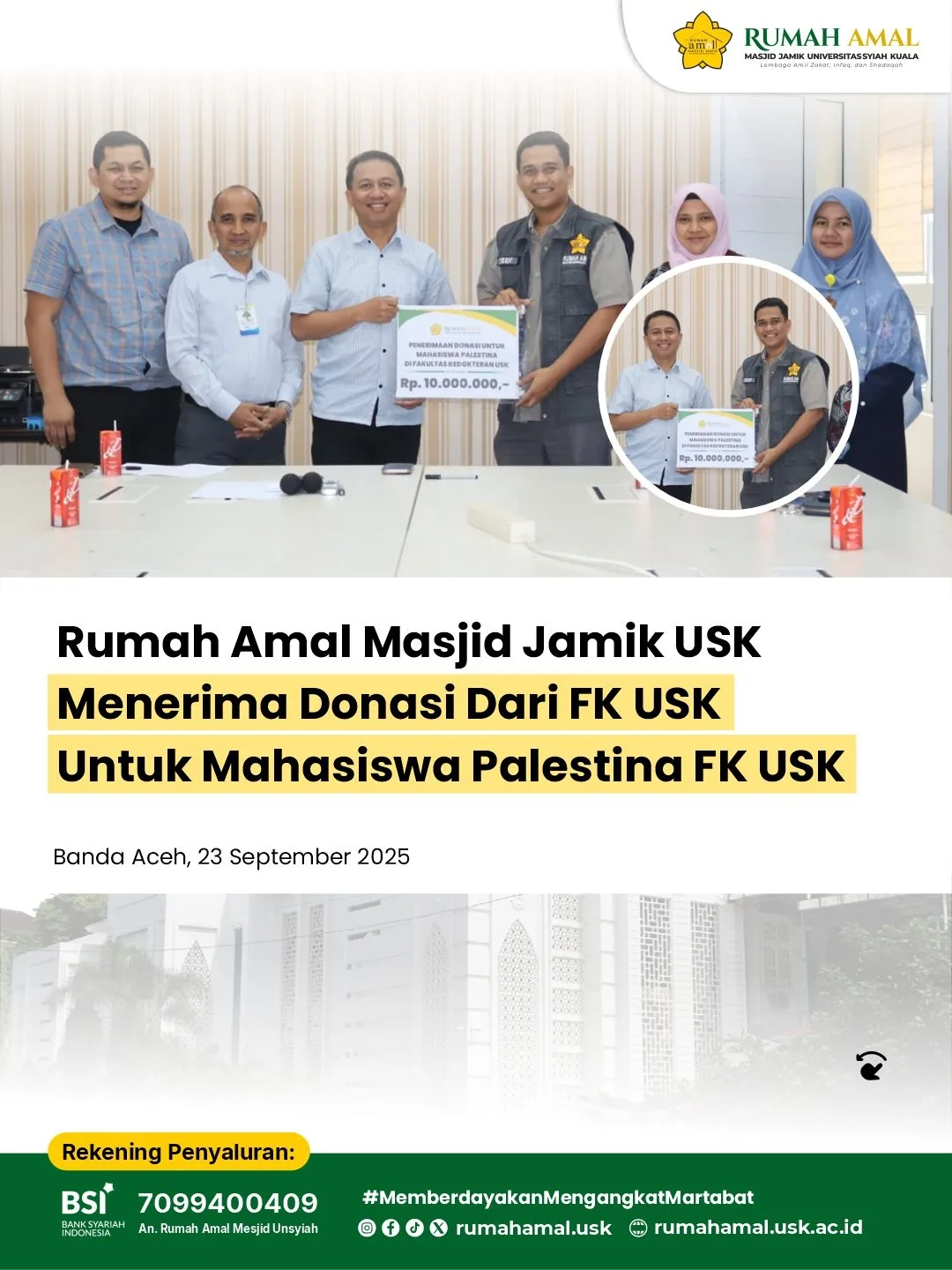 Banda Aceh, 23 September 2025 – Rumah Amal Masjid Jamik USK menerima donasi dari Fakultas Kedokteran Universitas Syiah Kuala untuk mahasiswa Palestina di lingkungan FK USK senilai Rp 10.000.000,-