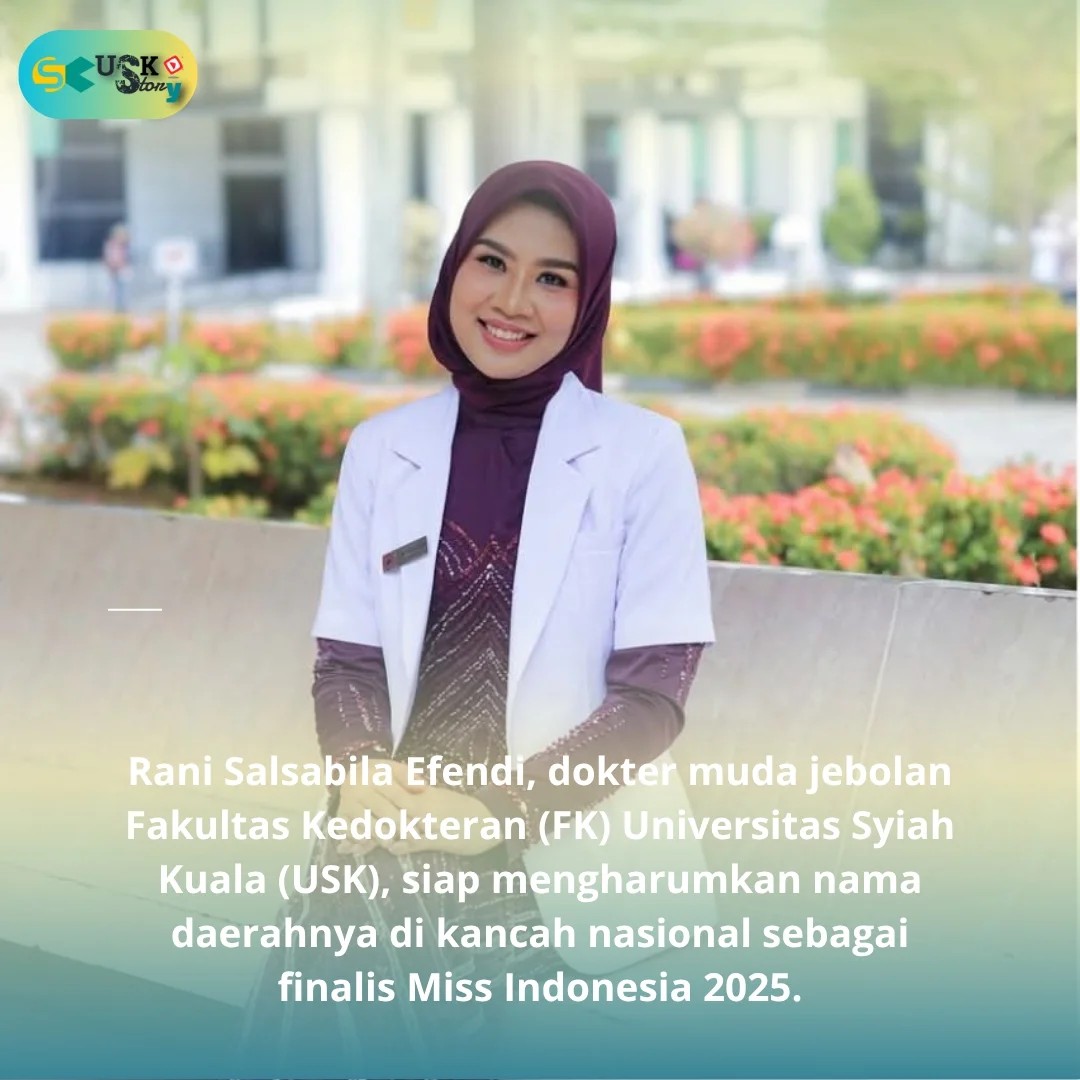 Rani Salsabila Efendi, dokter muda jebolan Fakultas Kedokteran (FK) Universitas Syiah Kuala (USK), siap mengharumkan nama daerahnya di kancah nasional sebagai finalis Miss Indonesia 2025.