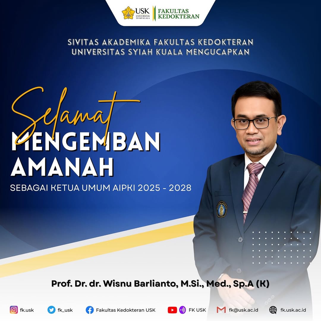 Sivitas Akademika Fakultas Kedokteran Universitas Syiah Kuala mengucapkan selamat mengemban amanah kepada: Prof. Dr. dr. Wisnu Barlianto, M.Si., Med., Sp.A(K) atas terpilihnya sebagai Ketua Umum Asosiasi Institusi Pendidikan Kedokteran...