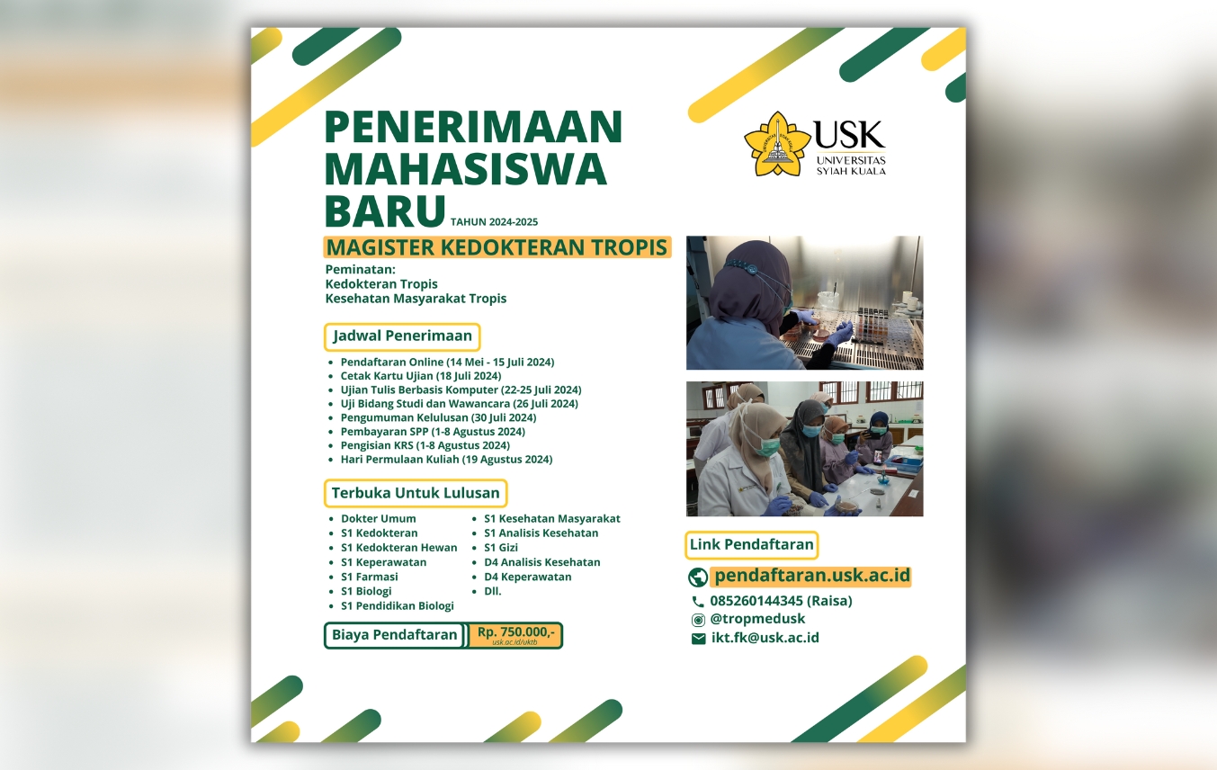 Universitas Syiah Kuala dengan bangga mengumumkan pembukaan penerimaan mahasiswa baru untuk Program Magister Kedokteran Tropis tahun 2024. Program ini menawarkan kesempatan bagi para calon mahasiswa untuk mengejar impian mereka...