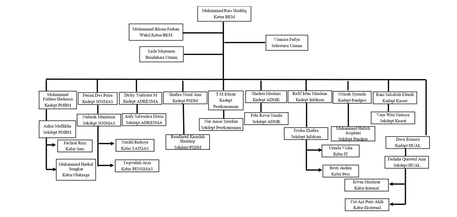 Struktur organisasi BEM Fakultas Kedokteran USK terdiri dari pengurus inti dan divisi kerja yang terorganisir untuk menjalankan fungsi kemahasiswaan secara efektif dan profesional.